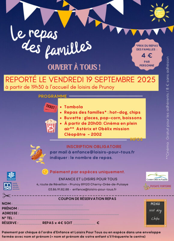 Repas à réserver par mail à enfance@loisirs-pour-tous.fr (indiquer le nombre de repas).